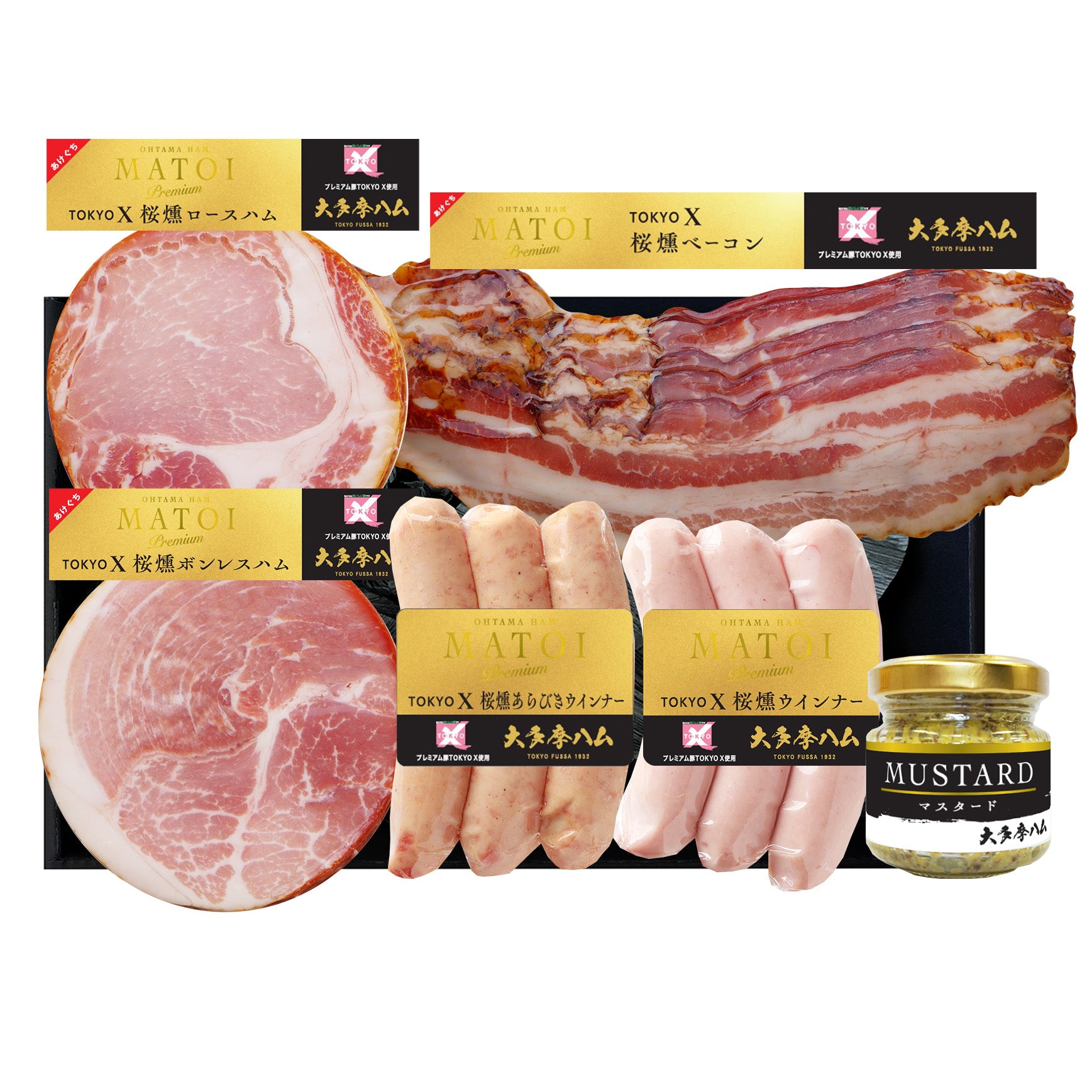TOKYOX 桜ロースハム63g、TOKYOX 桜燻ボンレスハム63g、TOKYOX桜ベーコン 65g、TOKYOX 桜燻あらびきウインナー60g、TOKYO X桜燻ウインナー60g、粒マスタード 40g |
